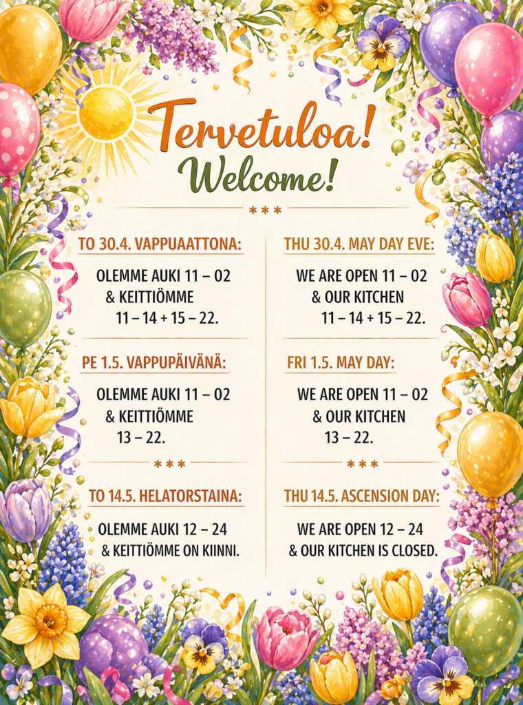 Juomien kyytipojiksi tarjoamme maukkaita ruokia niin pieneen naposteluun kuin pitkän kaavan ruokailuun.