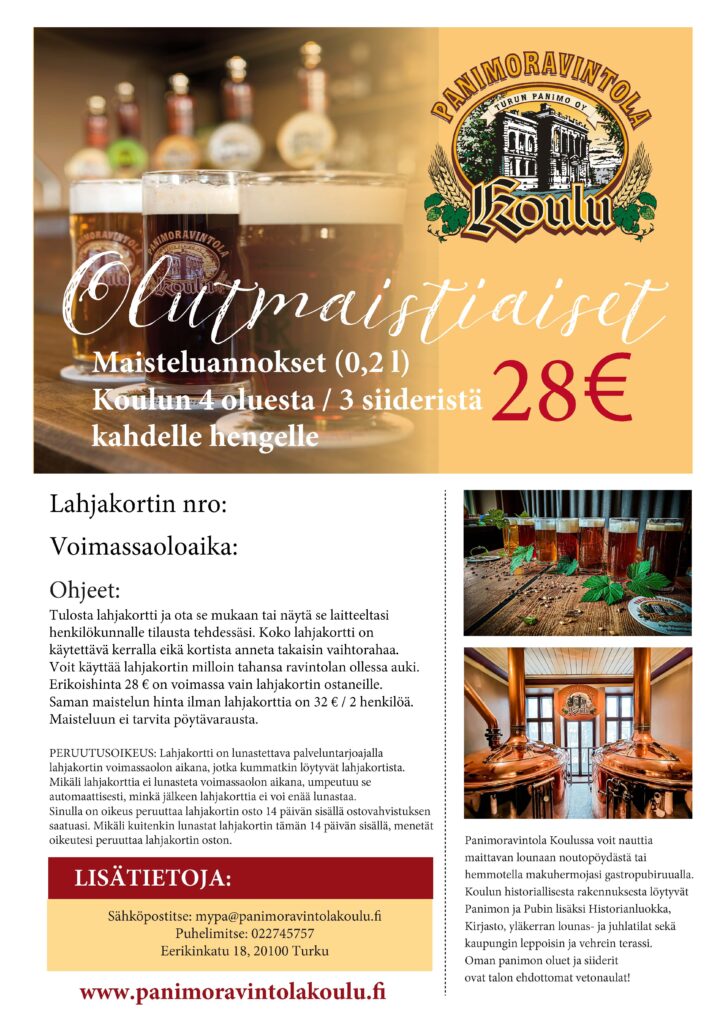 – neljän oluen maisteluun 14 € / hlö (normaalihinta 16 €/ hlö)