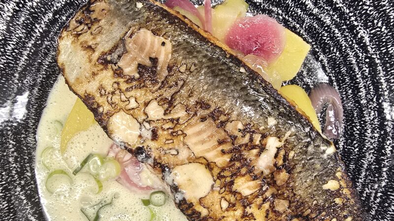 Hiillostettua siikaa, pikkelöityä peruna- vihannespaistosta ja