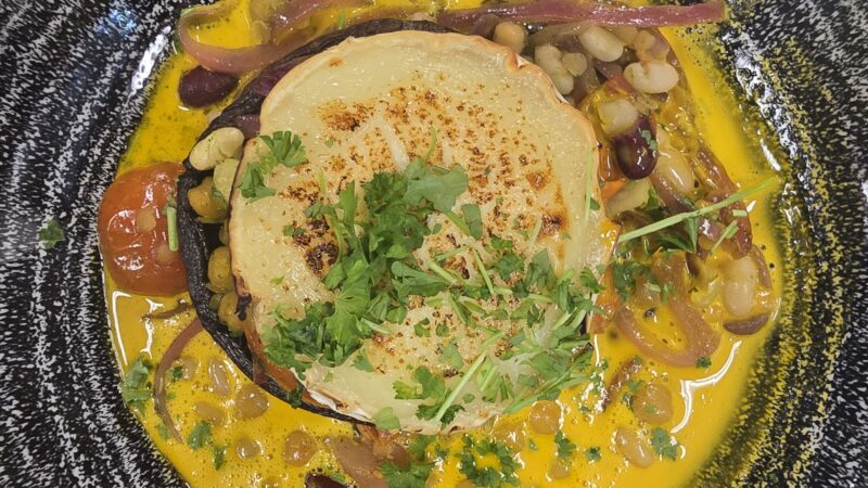 Juustolla / Vuustolla kuorrutettua portobelloa, papumuhennosta